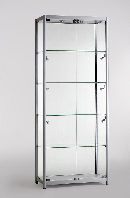 2 Dörrar med las, 8 halogen spotlights, Ram i eloxerad aluminium samt härdat säkerhetsglas.